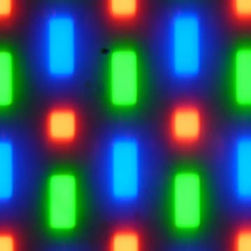 В этом экране используется OLED-матрица — активная матрица на органических светодиодах. Полноцветное изображение создается с помощью субпикселей трех цветов — красного (R), зеленого (G) и синего (B) в равном количестве, что подтверждается фрагментом микрофотографии: