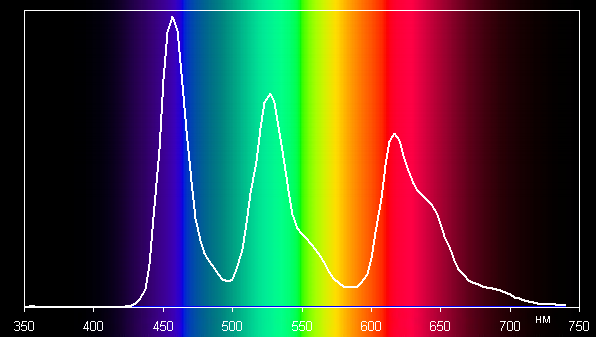 Спектр белого типичен для OLED — области первичных цветов хорошо разделены и имеют вид относительно узких пиков: