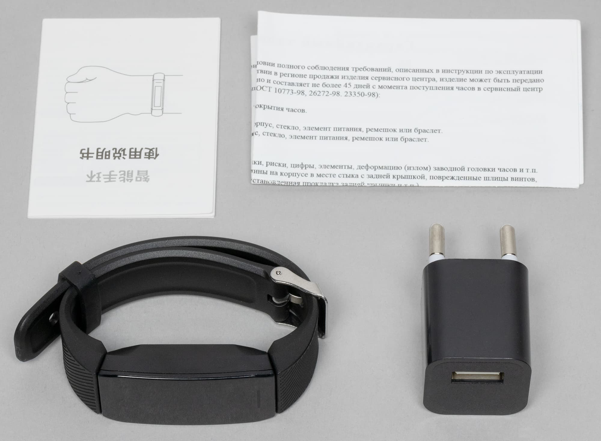 Внутри находится сам браслет, вставленный в поролон, инструкция на английском и китайском, гарантийный талон и маленький зарядный блок 5 В 1 А.