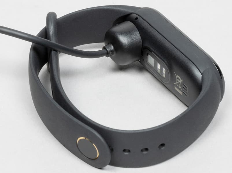 Зарядка подсоединяется к двум контактам на тыльной стороне. Решение неплохое, хотя и менее удобное, чем у браслетов с USB-штекером.