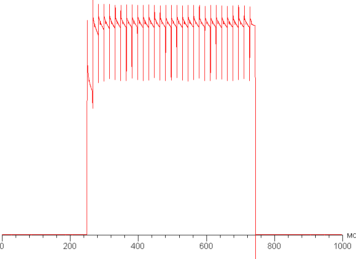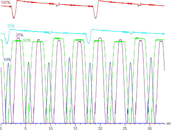 На любом уровне яркости присутствует значимая модуляция с частотой примерно 60 или 240 Гц. На рисунке ниже приведены зависимости яркости (вертикальная ось) от времени (горизонтальная ось) для нескольких значений настройки яркости: