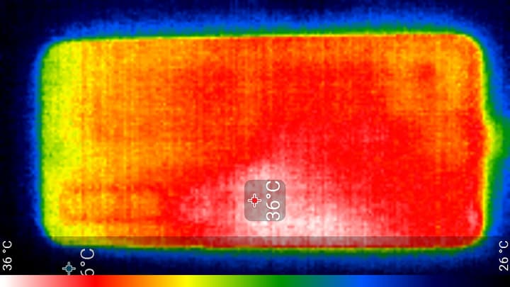 Нагрев чуть больше в средней правой части аппарата, что, видимо, соответствует расположению микросхемы SoC, однако почти вся задняя сторона нагрета равномерно, то есть используется какой-то радиатор. По данным теплокамеры, максимальный нагрев составил 36 градусов (при температуре окружающего воздуха в 24 градуса), это относительно немного.
