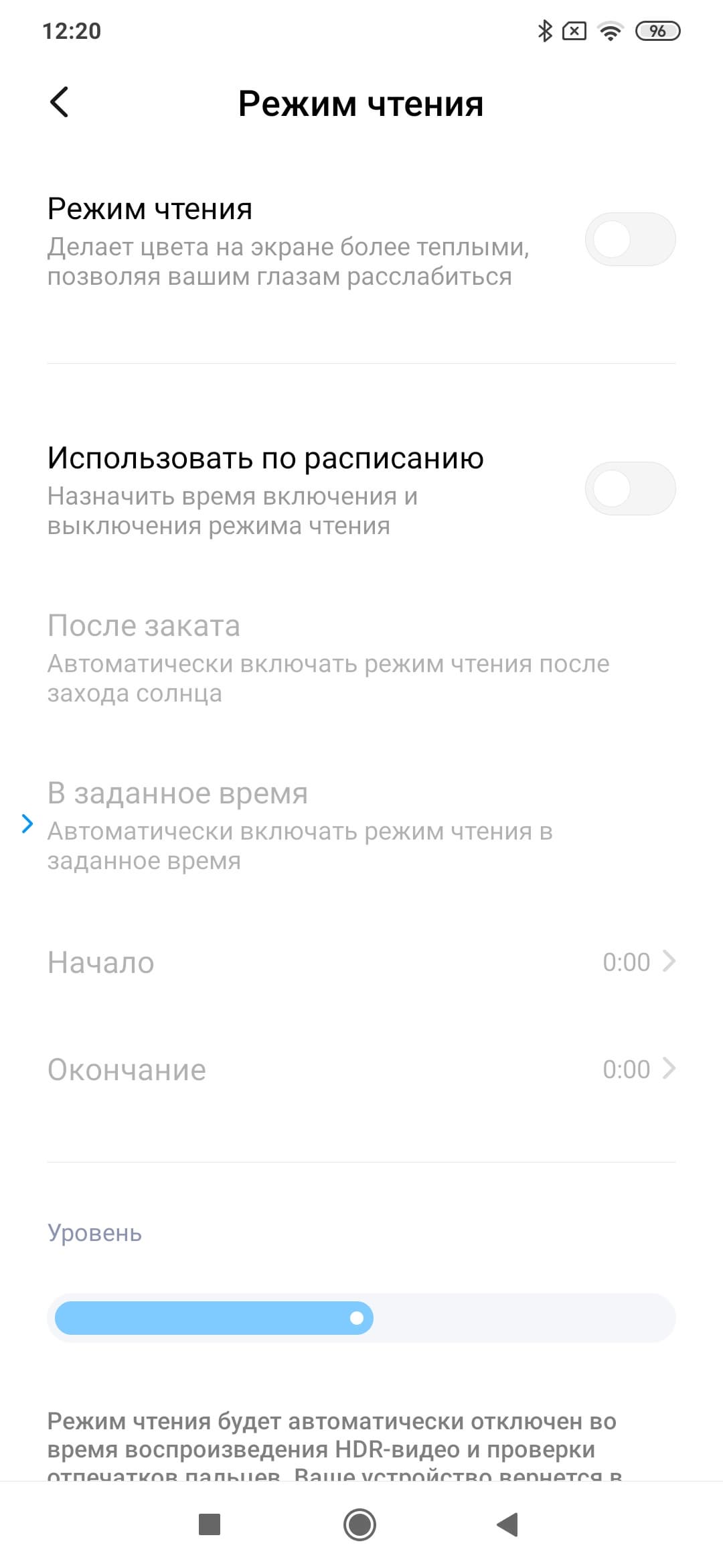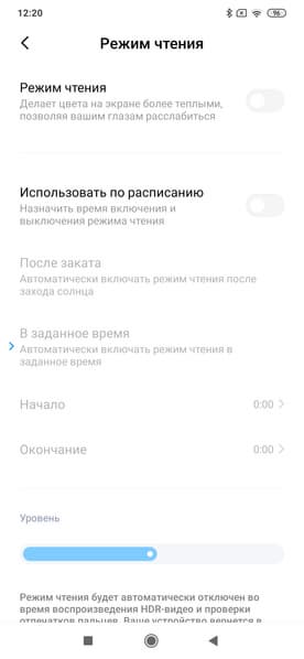 Конечно, есть режим с уменьшенной интенсивностью синей компоненты (Режим чтения). Напомним, что, в принципе, яркий свет может приводить к нарушению суточного (циркадного) ритма (см. статью про iPad Pro с дисплеем 9,7 дюйма), но все решается подстройкой яркости до комфортного уровня, а искажать цветовой баланс, уменьшая вклад синего, нет абсолютно никакого смысла.