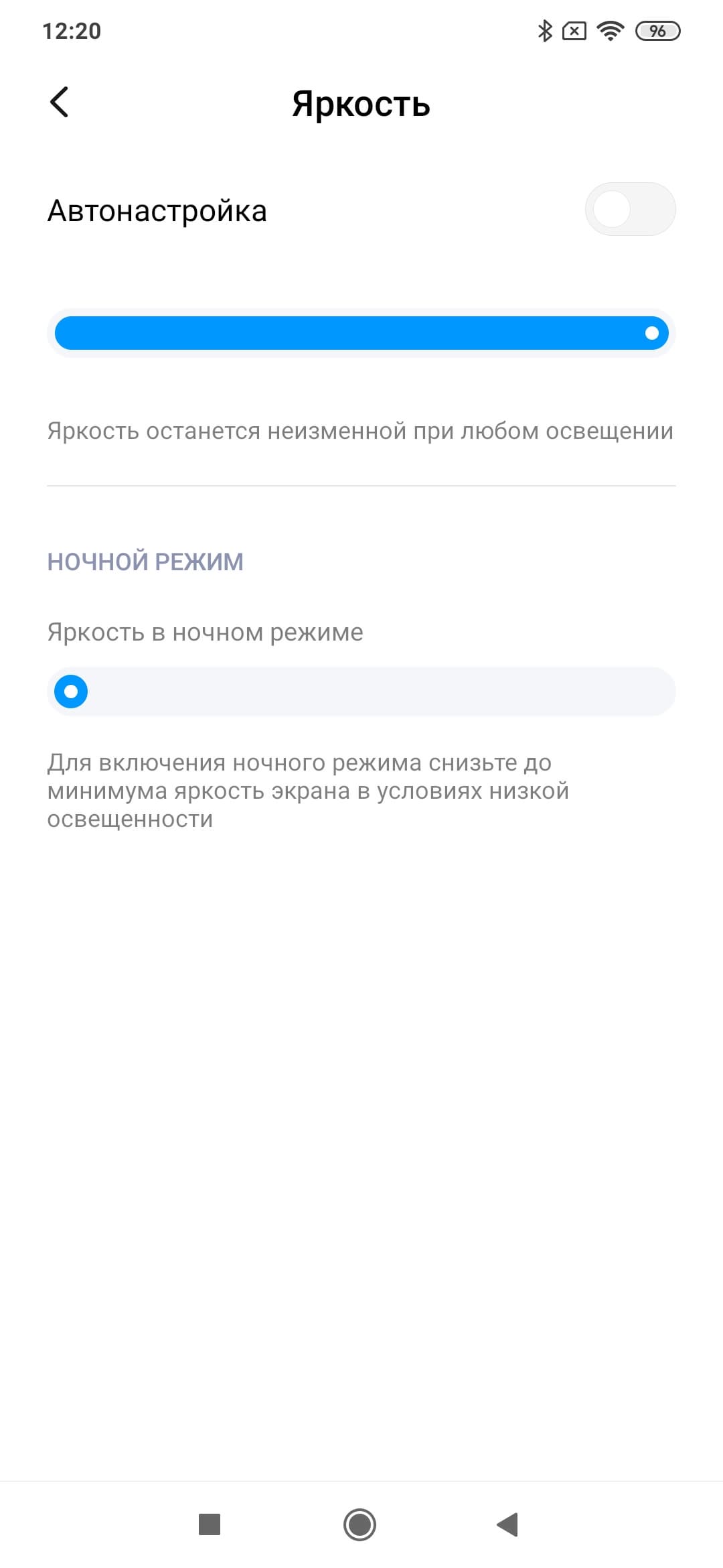 Есть и еще один вариант управления яркостью: привязка выбора минимальной яркости к установке яркости на минимум (в ручном или в автоматическом режиме). По факту можно просто изменить минимальный уровень яркости в ручном режиме с 2 до 3 кд/м².