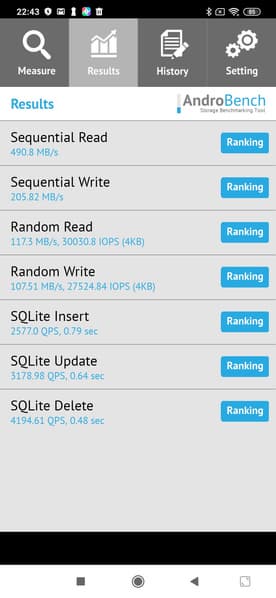Результаты теста AndroBench на скорость работы с памятью: