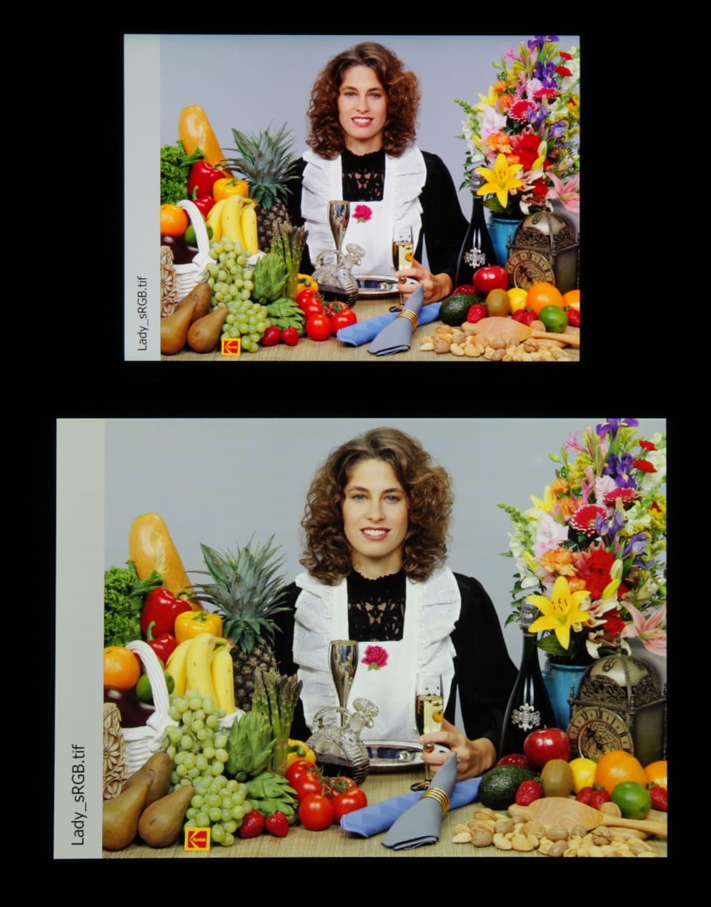 Цвета на экране Xiaomi Mi Note 2 перенасыщены (обратите внимание на помидоры, бананы, салфетку и оттенок лица) и цветовой баланс немного отличается. Заметим, что в данном случае картинка занимает в высоту (при этой ориентации экрана) всю доступную для вывода изображения область и заходит на загнутые края экрана, что приводит к затемнению и искажению цвета. Также на свету эти области почти всегда бликуют, что еще больше мешает при просмотре изображений, выведенных на весь экран. Напомним, что фотография не может служить надежным источником сведений о качестве цветопередачи и приводится только для условной наглядной иллюстрации. Фотография выше получена для профиля Automatic contrast в настройках экрана, всего их три: