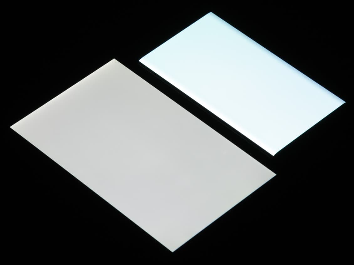 Лицевая поверхность экрана выполнена в виде стеклянной пластины с зеркально-гладкой поверхностью, устойчивой к появлению царапин. Судя по отражению объектов антибликовые свойства экрана лучше, чем у экрана Google Nexus 7 (2013) (далее просто Nexus 7). Для наглядности приведем фотографию, на которой в выключенных экранах отражается белая поверхность (слева — Nexus 7, справа — Xiaomi Mi Note 2, далее их можно различать по размеру):