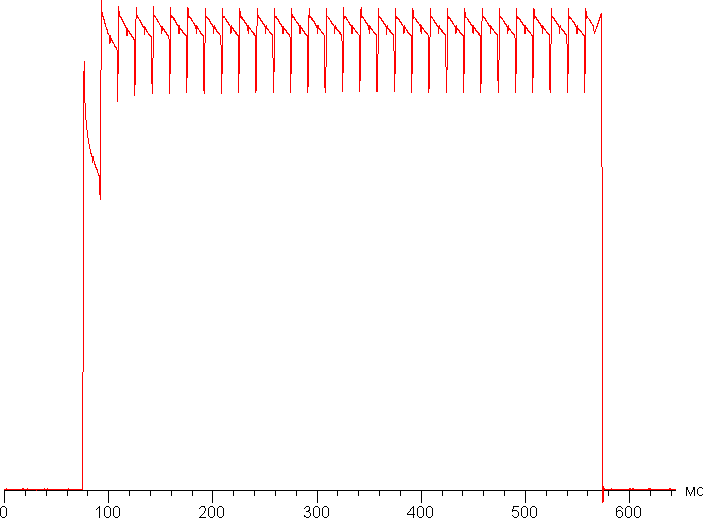 Переключение состояния элементов матрицы выполняется практически мгновенно, но на фронте включения может присутствовать ступенька шириной примерно 17 мс (что соответствует частоте обновления экрана примерно в 60 Гц). Например, так выглядит зависимость яркости от времени при переходе от черного к белому и обратно: