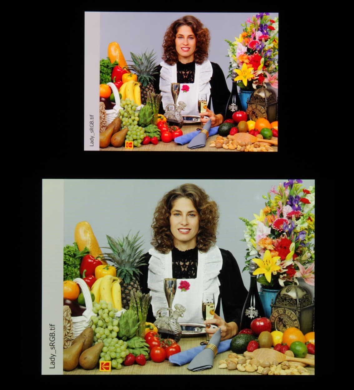 Отметим, что на экранах с широким цветовым охватом без соответствующей коррекции цвета обычных изображений, оптимизированных для устройств sRGB, выглядят неестественно насыщенными. Отсюда и рекомендация: в большинстве случаев смотреть кино, фотографии и все естественное лучше при выборе профиля Стандарт. Профиль Яркий уместен при просмотре материала с охватом DCI-P3, принятым в цифровом кинематографе, но в быту встречающимся редко.
