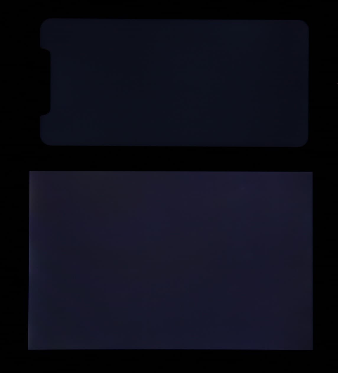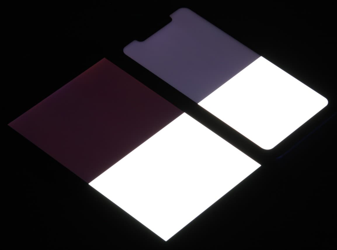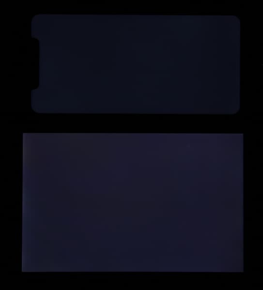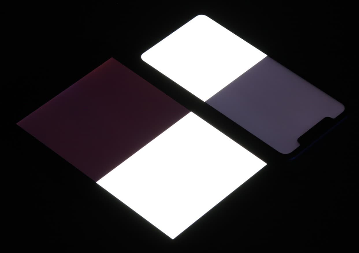 Яркость под углом у экранов уменьшилась (как минимум в 5 раз, исходя из разницы в выдержке), и уменьшилась примерно одинаково. Черное поле при отклонении по диагонали сильно высветляется и приобретает красно-фиолетовый оттенок. Фотографии ниже это демонстрируют (яркость белых участков в перпендикулярном плоскости экранов направлении одинаковая!):
