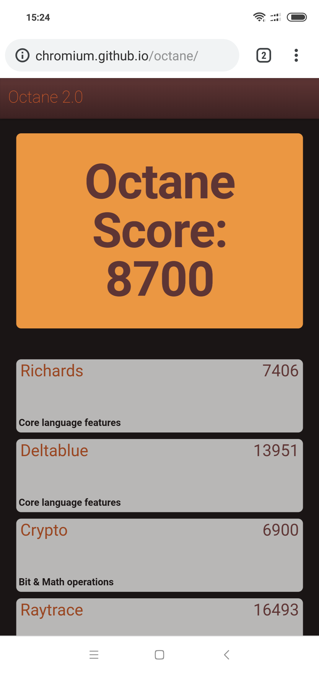 | Google Octane 2 (больше — лучше) | 8700 | 8908 | 10137 | 9521 | 9168 |
