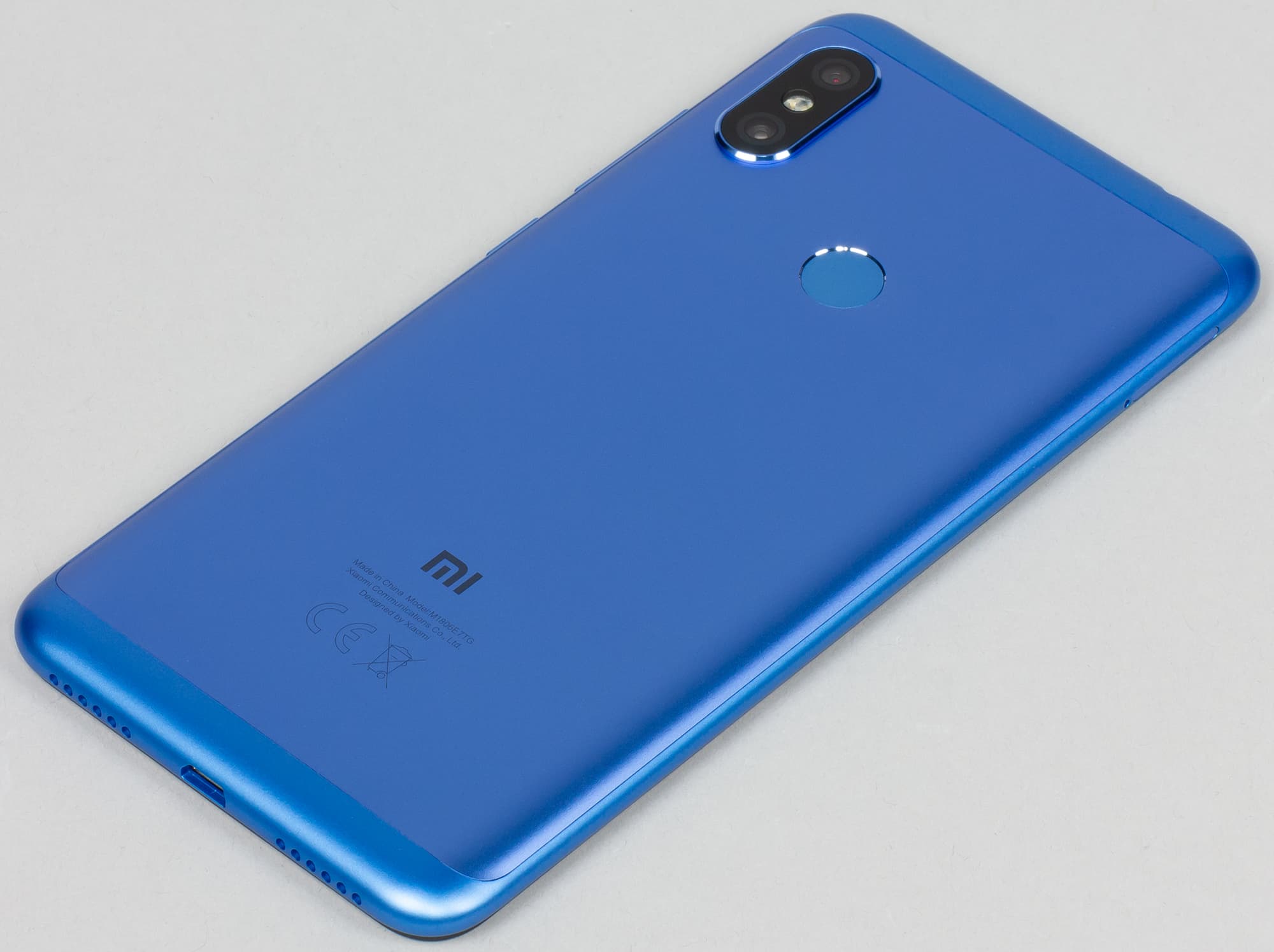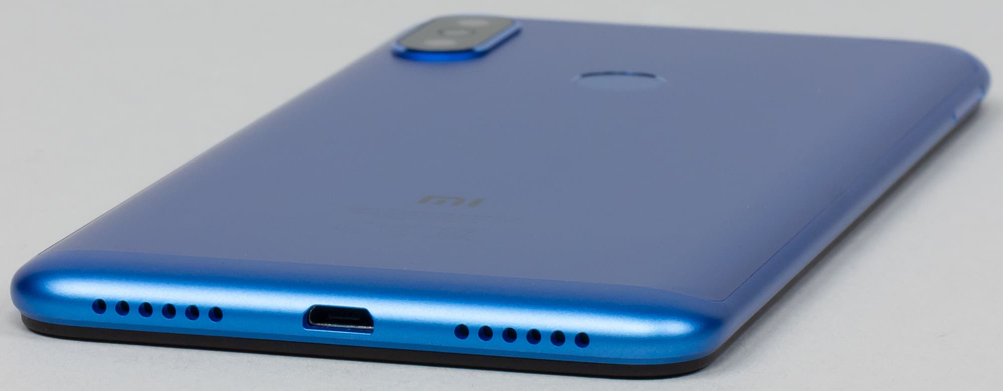 В нижнем торце опять наблюдаем интерфейсный разъем в стиле «ретро»: порт USB представлен разъемом Micro-USB. Сюда же выведен и основной громкоговоритель. В отличие от Redmi Note 5, здесь два ряда отверстий, но динамик за ними все так же один.