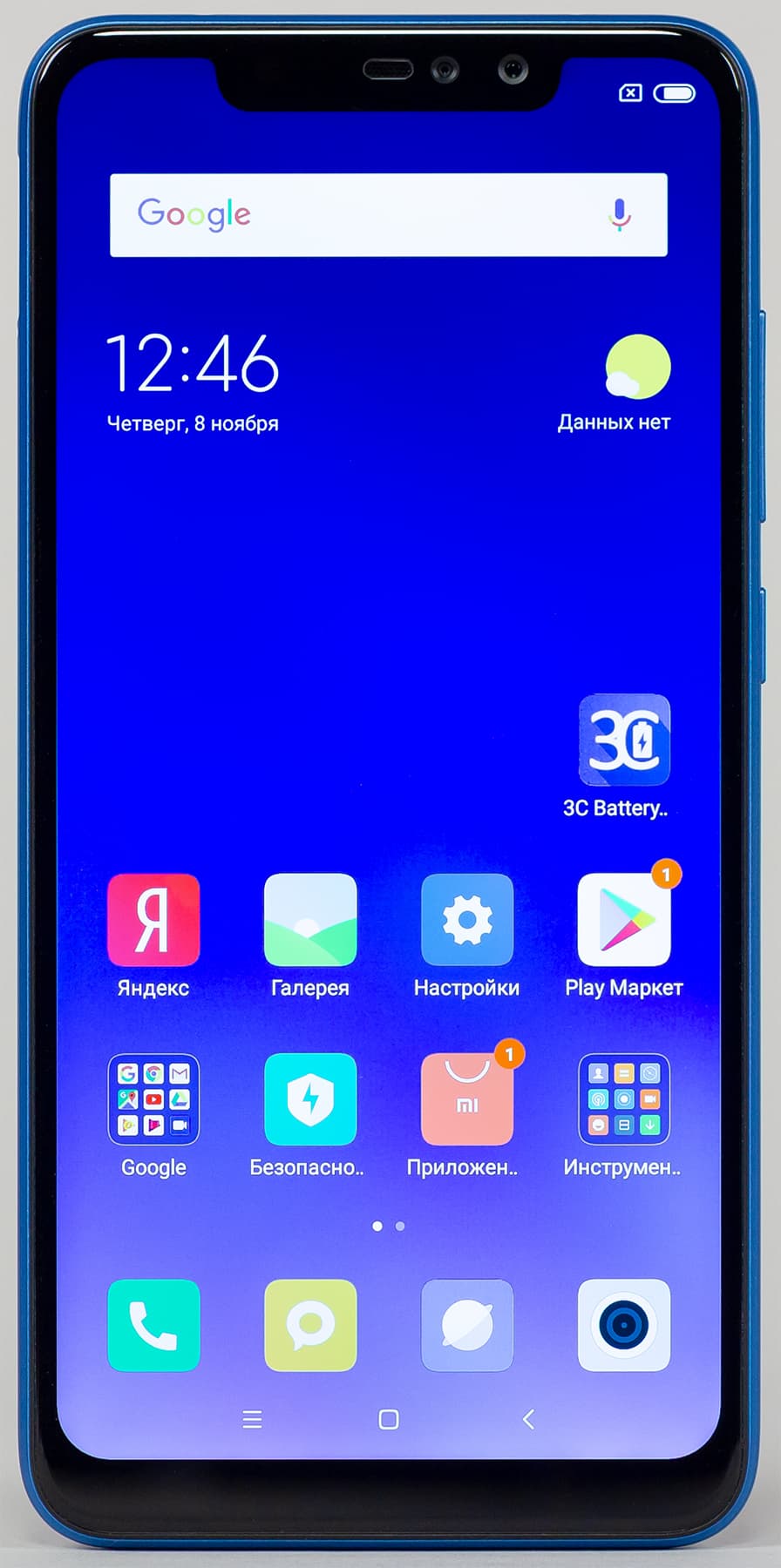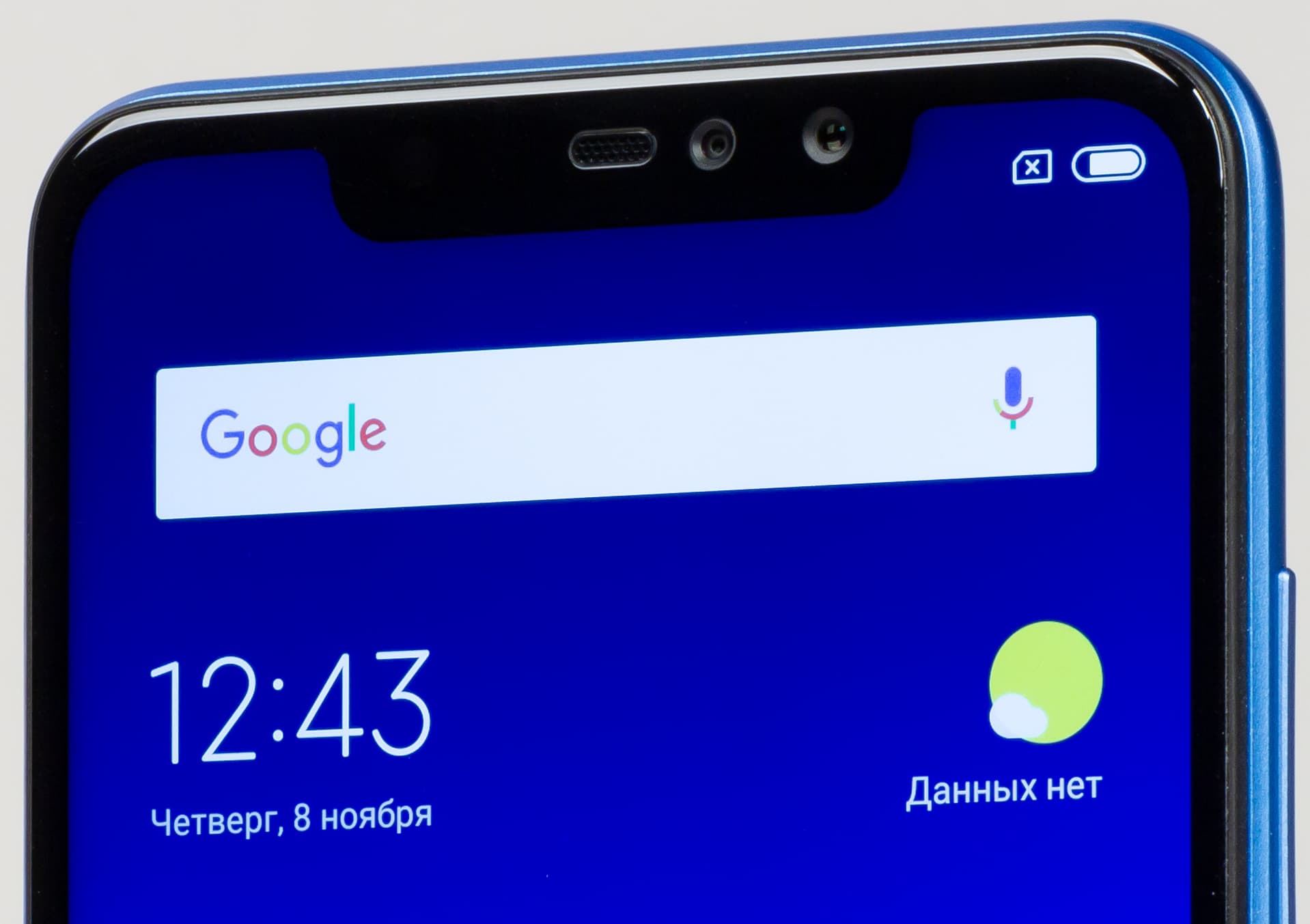 Светодиодный индикатор событий здесь есть, но он светит неярким молочным светом — через всю комнату его не заметишь. К сожалению, без пресловутой «челки» не обошлось, а до «каплевидного» выреза Xiaomi еще не дошла. В результате вырез зияет огромной некрасивой прорехой в дисплее.