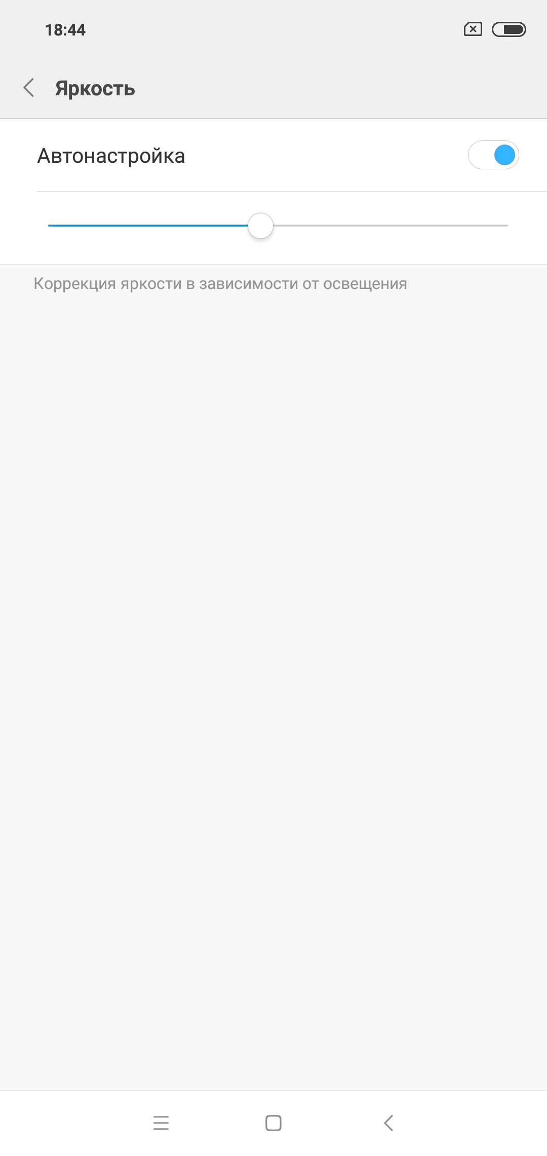 При ручном управлении яркостью и при выводе белого поля во весь экран максимальное значение яркости составило около 515 кд/м², минимальное — 1,4 кд/м². Максимальная яркость высокая, и, учитывая отличные антибликовые свойства, читаемость экрана даже в солнечный день вне помещения должна быть на хорошем уровне. В полной темноте яркость можно понизить до комфортного значения. В наличии автоматическая регулировка яркости по датчику освещенности (он находится слева от прорези фронтального громкоговорителя, близко к краю челки). В автоматическом режиме при изменении внешних условий освещенности яркость экрана как повышается, так и понижается. Работа этой функции зависит от положения ползунка регулировки яркости, им пользователь может попытаться выставить желаемый уровень яркости в текущих условиях. Если не вмешиваться, то в полной темноте функция автояркости уменьшает яркость до 4 кд/м² (низковато), в условиях освещенного искусственным светом офиса (примерно 550 лк) устанавливает на 150 кд/м² (нормально), в очень ярком окружении (соответствует освещению ясным днем вне помещения, но без прямого солнечного света — 20000 лк или немного больше) повышает до 515 кд/м² (до максимума, так и нужно). Мы немного увеличили яркость в полной темноте и получили в полной темноте 15 кд/м², в условиях освещенного искусственным светом офиса — 160 кд/м², в очень ярком окружении — 515 кд/м², такой результат нас устроил. Получается, что функция автоподстройки яркости работает адекватно и позволяет пользователю настраивать свою работу под индивидуальные требования. На любом уровне яркости значимая модуляция подсветки отсутствует, поэтому нет и никакого мерцания экрана.