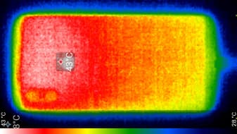 Нагрев локализован в верхней части аппарата, что, видимо, соответствует расположению микросхемы SoC. По данным теплокамеры, максимальный нагрев составил 43 градуса (при температуре окружающего воздуха в 24 градуса), это несколько выше среднего значения в данном тесте для современных смартфонов.