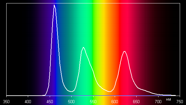 Спектры типичны для OLED — области первичных цветов хорошо разделены и имеют вид относительно узких пиков: