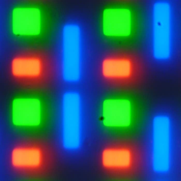 В этом экране используется OLED-матрица — активная матрица на органических светодиодах. Полноцветное изображение создается с помощью субпикселей трех цветов — красного (R), зеленого (G) и синего (B) в равном количестве, что подтверждается фрагментом микрофотографии: