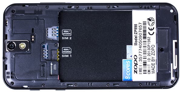 Задняя крышка здесь, как и у THL T100S съемная, крепится традиционно на нескольких пластиковых защелках, отрывается от корпуса, пожалуй, чуть более тяжело, чем хотелось бы. Для поддевания ногтем в углу имееся небольшой уступ. Когда смартфон в сборе, на внешней поверхности появляется чуть выпирающая из корпуса металлическая вставка с вмонтированными в нее окошками камеры и вспышки. В отличие от THL T100S, смартфон Zopo 998 не имеет предустановленного приложения, способного заставить работать вспышку в качестве фонарика.