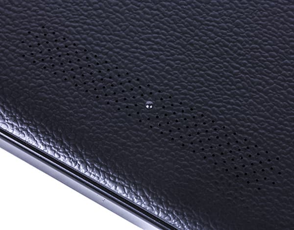 Ниже обустроена решетка для выхода звука из динамика, выполненная в виде блока массы мельчайших отверстий в этой псевдокоже. Выглядит очень симпатично и достойно, а для поднятия над поверхностью стола здесь предусмотрен едва заметный пластиковый пупырышек.