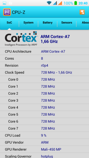 - SoC MediaTek MT6592, 1,7 ГГц, 8 ядер, ARM Cortex-A7