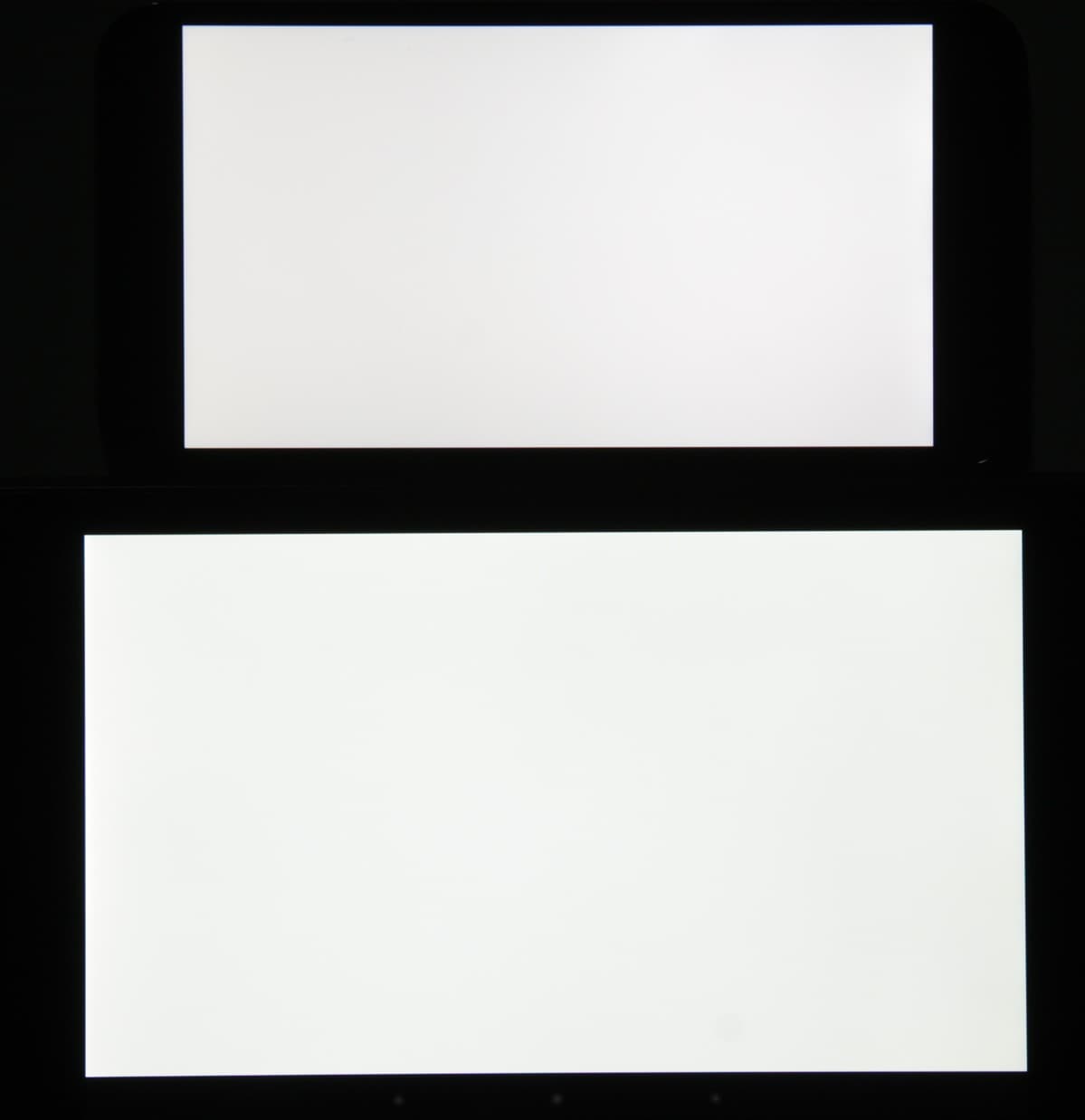 Экран имеет хорошие углы обзора без значительного сдвига цветов даже при больших отклонениях взгляда от перпендикуляра к экрану и без инвертирования оттенков. Для сравнения приведем фотографии, на которых на экраны Zopo ZP998 и Nexus 7 выведены одинаковые изображения, при этом яркость экранов изначально установлена примерно на 200 кд/м². Перпендикулярно к экранам белое поле: