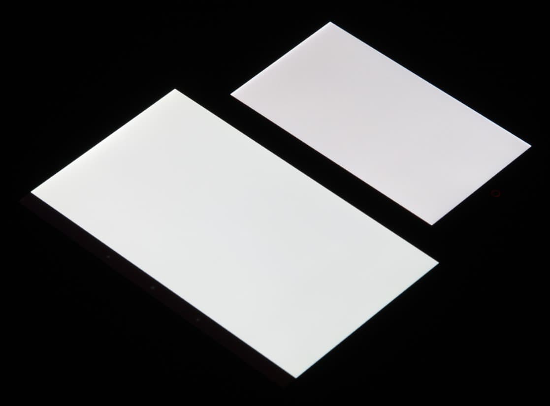 Лицевая поверхность экрана выполнена в виде стеклянной пластины с зеркально-гладкой поверхностью, устойчивой к появлению царапин. Судя по отражению объектов антибликовые свойства экрана не хуже, чем у экрана Google Nexus 7 (2013) (далее просто Nexus 7). Для наглядности приведем фотографию, на которой в выключенных экранах отражается белая поверхность (слева — Nexus 7, справа — Zopo ZP920, далее их можно различать по размеру):
