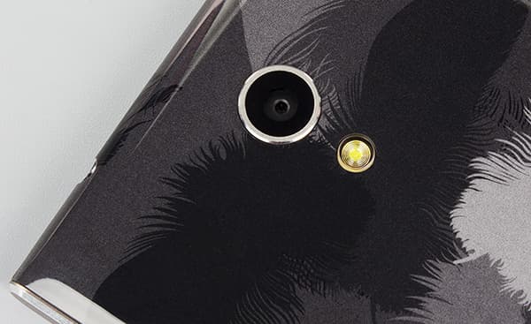 На тыльной поверхности смартфона привычно расположились окошко камеры, обрамленное металлическим колечком, и одиночная светодиодная вспышка, с помощью штатной программы способная функционировать в качестве фонарика.