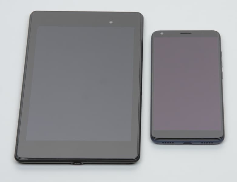 Лицевая поверхность экрана выполнена в виде стеклянной пластины с зеркально-гладкой поверхностью, устойчивой к появлению царапин. Судя по отражению объектов, антибликовые свойства экрана лучше, чем у экрана Google Nexus 7 (2013) (далее просто Nexus 7). Для наглядности приведем фотографию, на которой в выключенных экранах отражается белая поверхность (слева — Nexus 7, справа — ZTE Blade V9 Vita, далее их можно различать по размеру):
