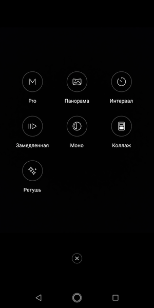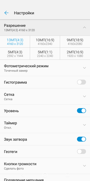 Есть несколько специальных режимов: ручной, ретушь, монохромный; есть даже встроенная возможность создания коллажей. Меню настроек наглядное и интуитивно понятное: можно отключить звук затвора, вывести на экран сетку, уровень и даже гистограмму, есть функция подавления мерцания. Поддерживается автоматический режим HDR. В RAW снимки штатно сохранять нельзя.
