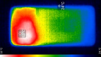 Нагрев локализован в верхней части аппарата ближе к правому краю, что, видимо, соответствует расположению микросхемы SoC. По данным теплокамеры, максимальный нагрев составил 53 градуса (при температуре окружающего воздуха в 24 градуса), это очень сильный нагрев.