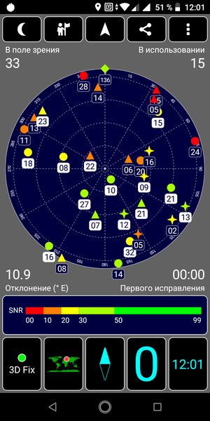 Навигационный модуль работает с GPS (с A-GPS) и с отечественной Глонасс, а также программа обнаружила спутники китайской Beidou, хотя ее поддержка в спецификациях не значится. Первые спутники даже при холодном старте обнаруживаются достаточно быстро, в течение первой минуты, точность позиционирования не вызывает претензий.