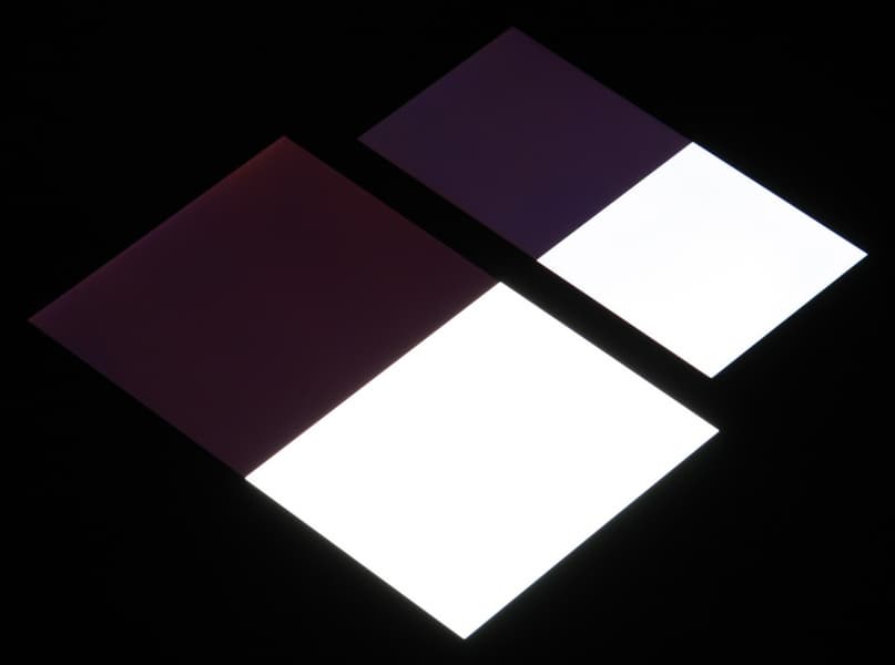 Черное поле при отклонении по диагонали высветляется слабо и приобретает красноватый или фиолетовый оттенок. Фотографии ниже это демонстрируют (яркость белых участков в перпендикулярном плоскости экранов направлении одинаковая!):