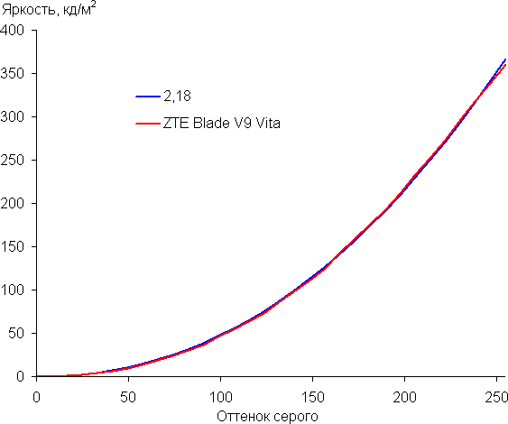 Контрастность (примерно в центре экрана) высокая — порядка 1100:1. Время отклика при переходе черный-белый-черный равно 19 мс (10 мс вкл. + 9 мс выкл.). Переход между полутонами серого 25% и 75% (по численному значению цвета) и обратно в сумме занимает 31 мс. Построенная по 32 точкам с равным интервалом по численному значению оттенка серого гамма-кривая не выявила завала ни в светах, ни в тенях. Показатель аппроксимирующей степенной функции равен 2,18, что чуть-чуть ниже стандартного значения 2,2. При этом реальная гамма-кривая немного отклоняется от степенной зависимости:
