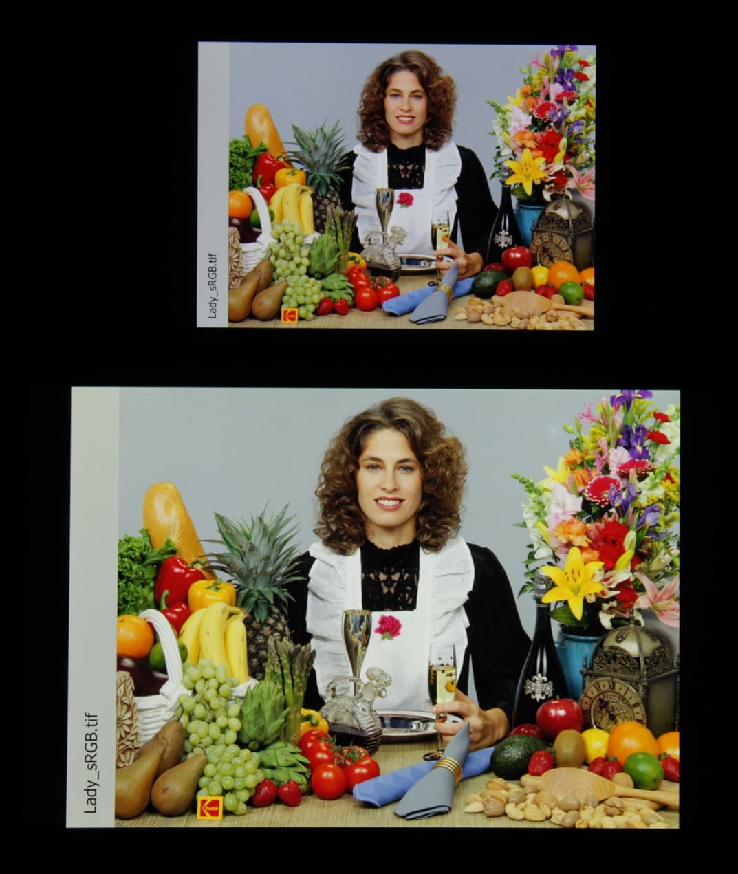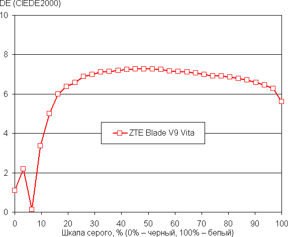 Баланс оттенков на шкале компромиссный, так как цветовая температура выше стандартных 6500 К, но отклонение от спектра абсолютно черного тела (ΔE) ниже 10, что для потребительского устройства считается хорошим показателем. При этом цветовая температура и ΔE мало изменяются от оттенка к оттенку — это положительно сказывается на визуальной оценке цветового баланса. (Самые темные области шкалы серого можно не учитывать, так как там баланс цветов не имеет большого значения, да и погрешность измерений цветовых характеристик на низкой яркости большая.)