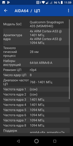 - SoC Qualcomm Snapdragon 435, 8 ядер ARM Cortex-A53 @1,1/1,4 ГГц