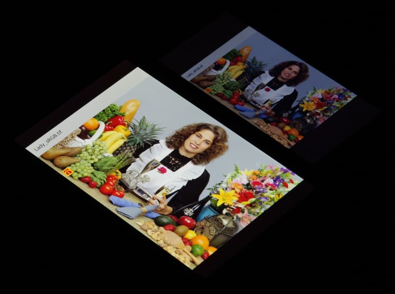 Экран имеет хорошие углы обзора без значительного сдвига цветов даже при больших отклонениях взгляда от перпендикуляра к экрану и без инвертирования (кроме самых-самых темных при отклонении по одной диагонали) оттенков. Для сравнения приведем фотографии, на которых на экраны ZTE Blade V9 Vita и Nexus 7 выведены одинаковые изображения, при этом яркость экранов изначально установлена примерно на 200 кд/м² по белому полю во весь экран, а цветовой баланс на фотоаппарате принудительно переключен на 6500 К.