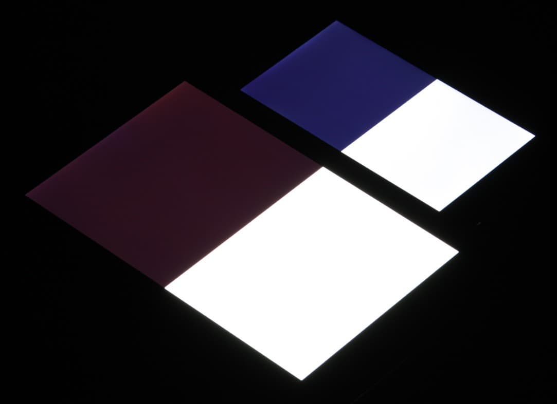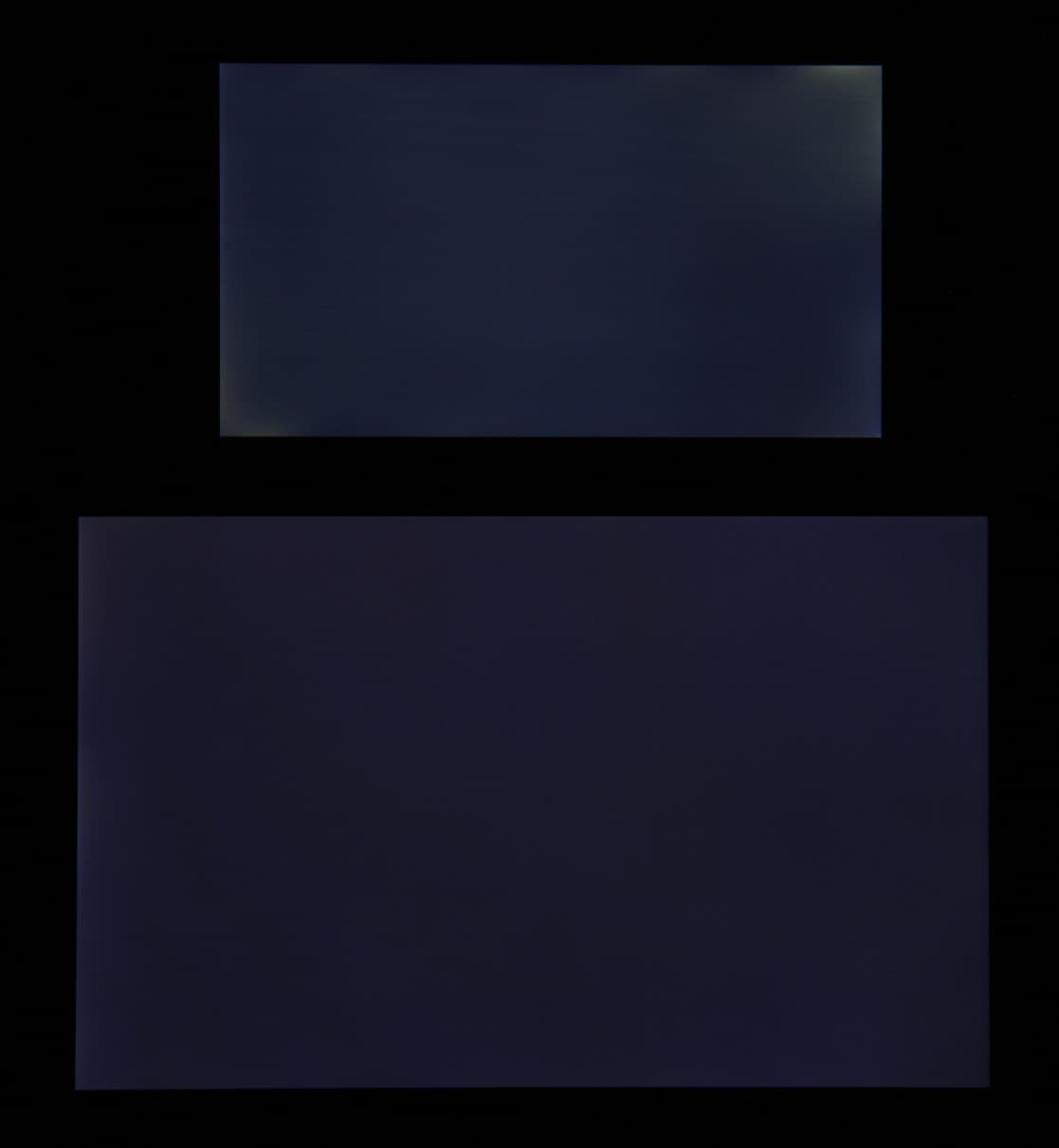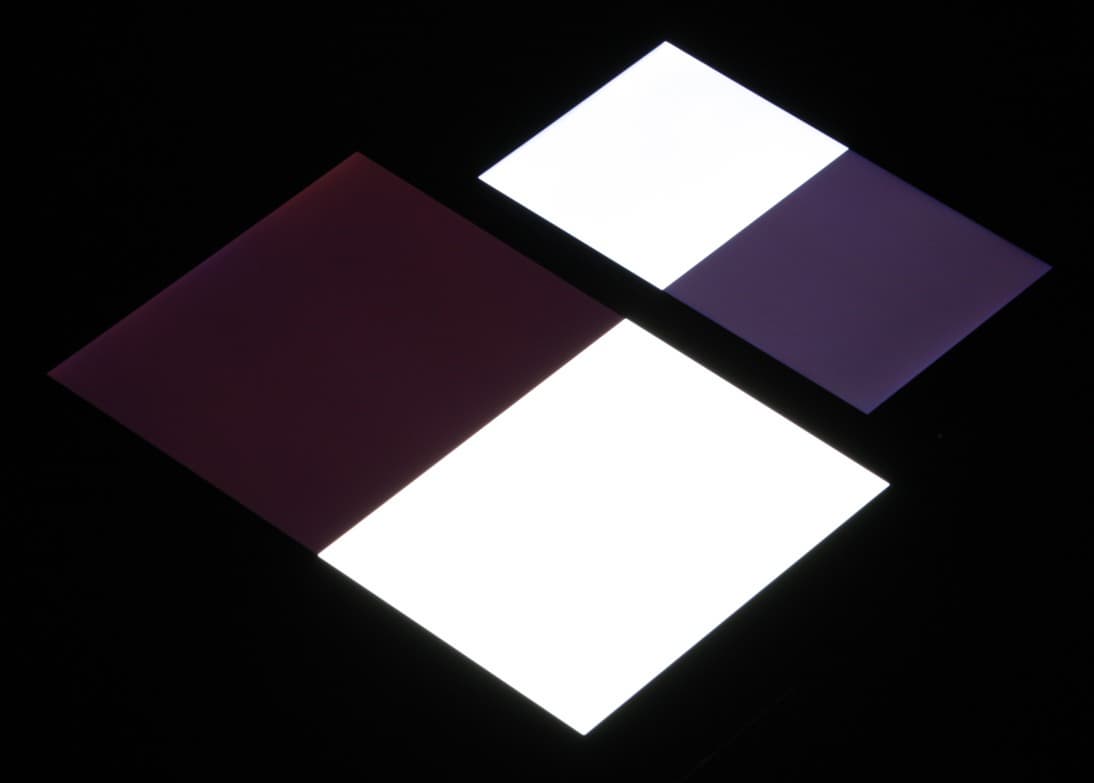 Яркость под углом у экранов уменьшилась (как минимум в 5 раз, исходя из разницы в выдержке), но у ZTE Blade X7 экран гораздо темнее. Черное поле при отклонении по диагонали высветляется в средней степени и приобретает фиолетовый или красно-фиолетовый оттенок. Фотографии ниже это демонстрируют (яркость белых участков в перпендикулярном плоскости экранов направлении одинаковая!):