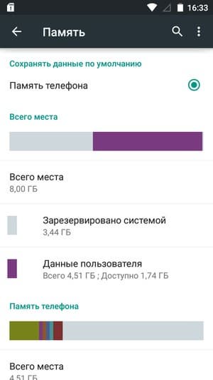 Объем оперативной памяти смартфона составляет 2 ГБ. В аппарате установлено 8 ГБ флэш-памяти, из которой всего 4,5 ГБ доступно для нужд пользователя, а остальное зарезервировано для системы и приложений. Объем памяти можно увеличить за счет карт microSD, а вот режим подключения внешних устройств к порту Micro-USB (OTG) в аппарате не поддерживается.