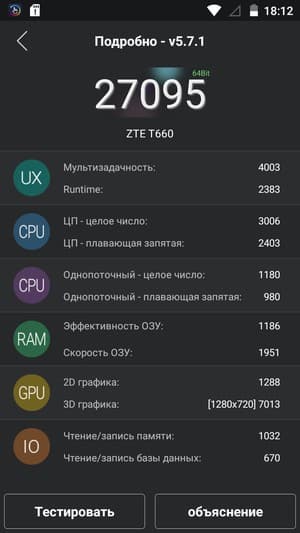 Установленная в ZTE Blade X7 платформа MT6735 является бюджетным вариантом уровня ниже среднего, однако по результатам тестирования даже ей удалось опередить во всех тестах (как комплексных, так и специализированных) аналогичную по уровню позиционирования платформу Qualcomm Snapdragon 410, чрезвычайно часто сейчас встречающуюся на рынке в устройствах бюджетного сегмента. По результатам тестов в популярном AnTuTu v 5.x аппарат показал около 27К очков в 64-разрядном, и почти столько же (около 26К) в 32-битном варианте теста. Добавить здесь особенно нечего, платформа далека по своим возможностям от максимально производительных современных платформ, которые устанавливаются во флагманские решения. Удел устройств с такой начинкой — бюджетный уровень, не более того. Тем не менее, описываемый сегодня смартфон достаточно производительный, чтобы его возможностей еще на какое-то время хватало для выполнения практически любых задач, в том числе и нетребовательных 3D-игр.