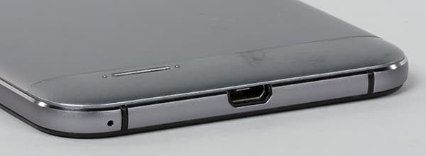 На нижнем торце при этом оказался лишь разъем Micro-USB и отверстие разговорного микрофона. Разъем Micro-USB, а также установленный на верхнем торце аудиовыход диаметром 3,5 мм для миниджека наушников имеют пластиковые вставки, чтобы края металлической рамки не царапались штекерами (и наоборот). Порт Micro-USB неожиданно не поддерживает подключение внешних устройств в режиме OTG.