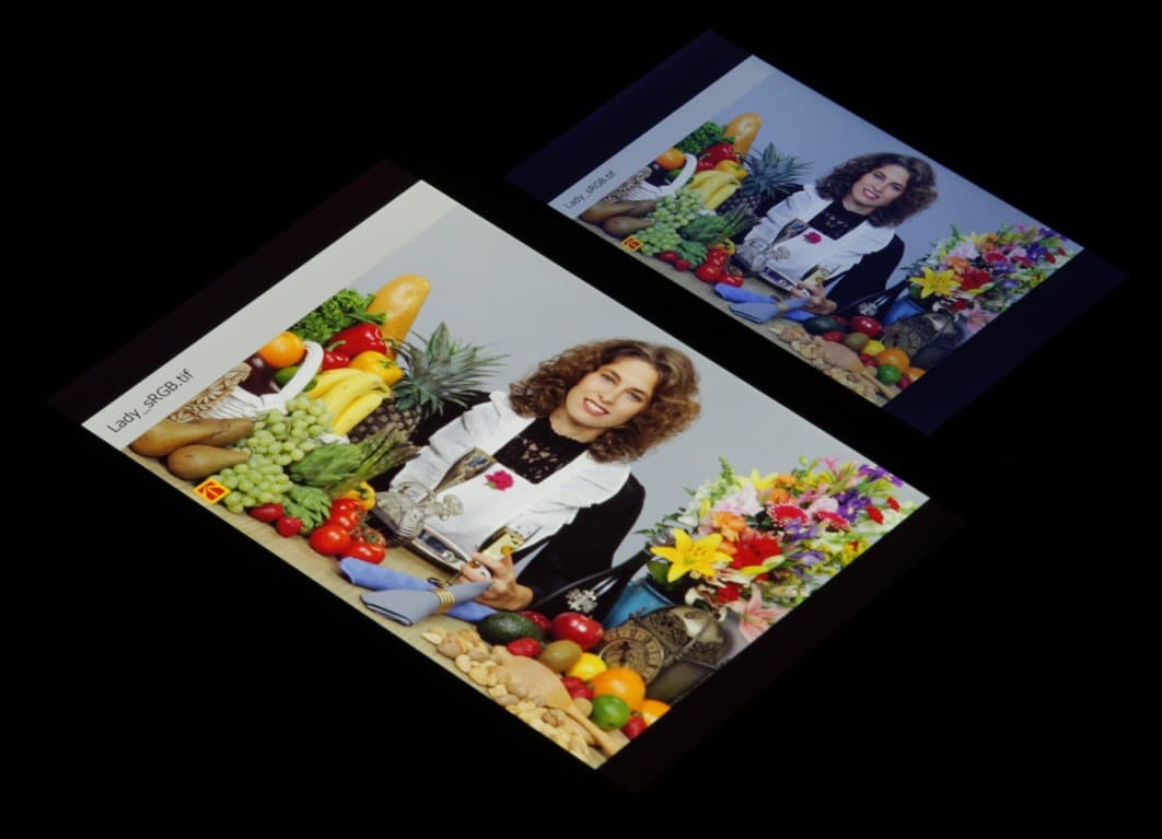 В итоге цвета имеют естественную насыщенность. Баланс оттенков на шкале серого хороший, так как цветовая температура пусть и существенно выше стандартных 6500 К, но отклонение от спектра абсолютно черного тела (ΔE) ниже 10, что для потребительского устройства считается приемлемым показателем. При этом цветовая температура и ΔE мало изменяются от оттенка к оттенку — это положительно сказывается на визуальной оценке цветового баланса. (Самые темные области шкалы серого можно не учитывать, так как там баланс цветов не имеет большого значения, да и погрешность измерений цветовых характеристик на низкой яркости большая.)