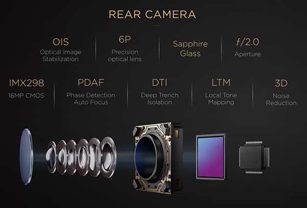 Основная камера оснащена 16-мегапиксельной матрицей Sony IMX298 CMOS и шестикомпонентным объективом с диафрагмой f/2,0 и ИК-фильтром с сапфировым стеклом, оптической стабилизацией и обновленной системой NeoVision 6.0. Камера хвастает технологией производства сенсора DTI (Deep Trench Isolation), тоновой корректировкой снимков LTM (Local Tone Mapping) и технологией подавления шумов в изображении 3D Noise Reduction.