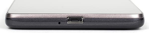 Разъем Micro-USB, расположенный на нижнем торце, поддерживает работу лишь в режиме USB 2.0, но имеется возможность подключения внешних устройств (USB OTG). Рядом с разъемом виднеется отверстие разговорного микрофона, еще два дополнительных микрофона, служащие для шумоподавления, размещены в верхней части корпуса. Никакими заглушками разъемы ZTE nubia Z5s не снабжены, смартфон не имеет защиты от воды и грязи. Крепления для ремешка на корпусе аппарата также не нашлось.