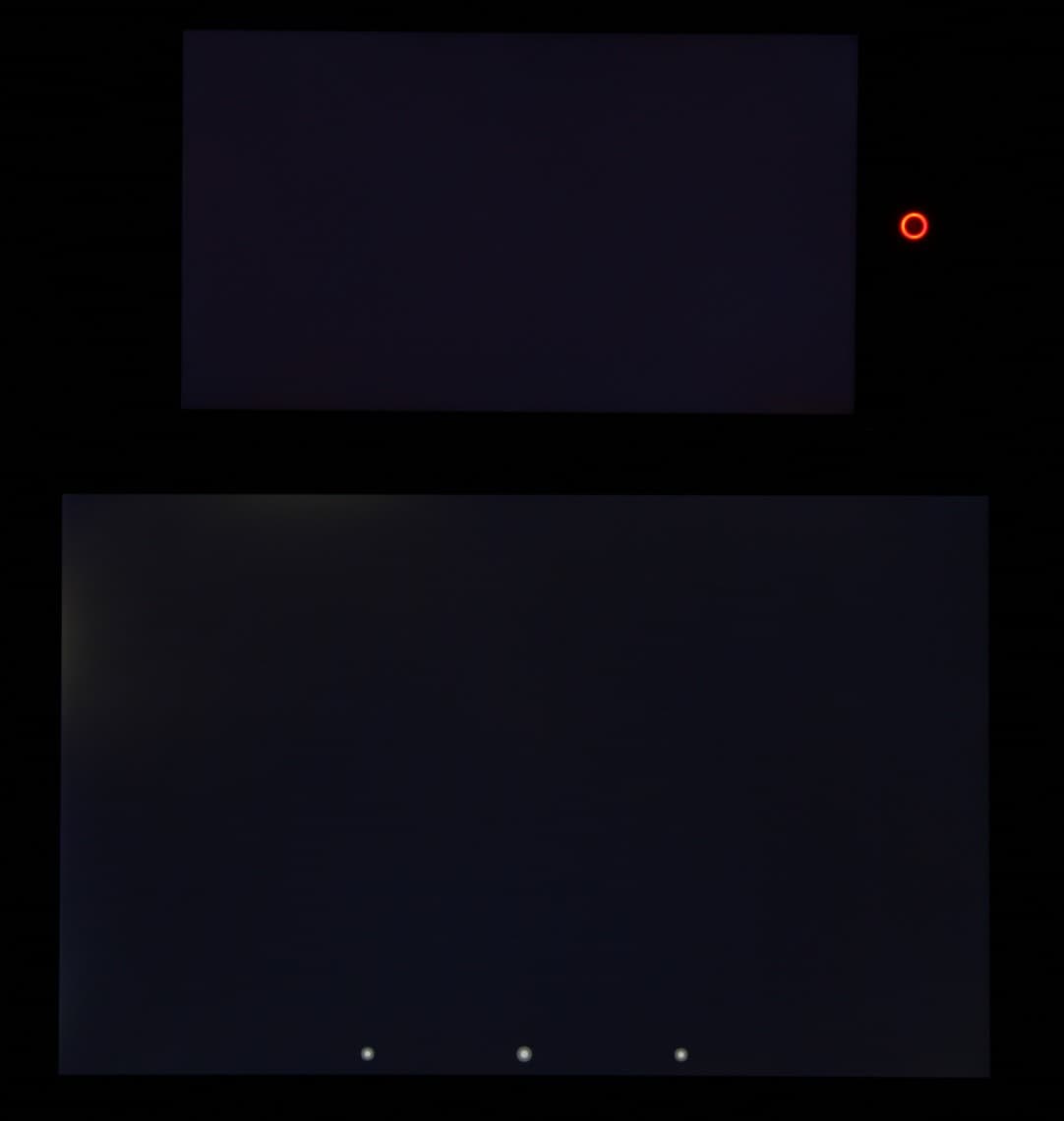 Яркость под углом у экранов уменьшилась (как минимум в 5 раз, исходя из разницы в выдержке), но в случае ZTE nubia Z5s экран на этой фотографии все же чуть ярче. Черное поле при отклонении по диагонали высветляется слабо и приобретает красно-фиолетовый оттенок или остается почти нейтрально-серым. Фотографии ниже это демонстрируют (яркость белых участков в перпендикулярном плоскости экранов направлении у экранов одинаковая!):
