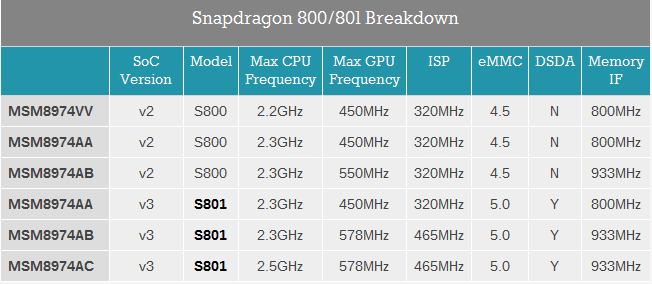 | SoC | Qualcomm Snapdragon 801 (4 ядра Krait 400) @2,0 ГГц | Qualcomm Snapdragon 801 (4 ядра Krait 400) @2,3 ГГц | Qualcomm Snapdragon 801 (4 ядра Krait 400) @2,3 ГГц | Qualcomm Snapdragon 801 (4 ядра Krait 400) @2,5 ГГц |