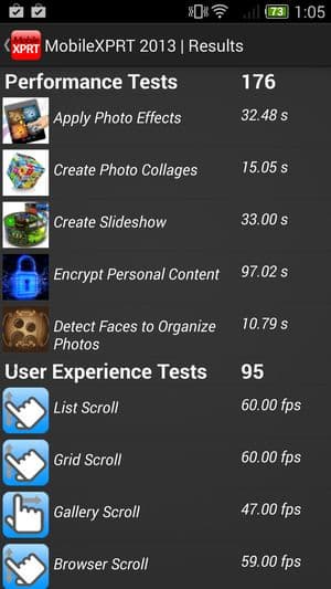 По результатам тестирования в бенчмарках аппарат показал себя одним из самых мощных и производительных современных мобильных аппаратов на рынке. В тесте AnTuTu испытуемый показал даже более высокие результаты, чем такие общепризнанные мировые лидеры, Samsung Galaxy S5, Sony Xperia Z2 и HTC One. Однако не совсем пока понятно, как результаты двух версий популярного бенчмарка коррелируют между собой, ведь теперь на смену четвертой версии пришла пятая, и все новые аппараты отныне тестируются в ней. Привели ли разработчики все к общему знаменателю, неизвестно, так что пока придется помечать в табличках, в какой версии бенчмарка тестировалась та или иная модель. Впрочем, разница между конкурентами на Snapdragon 801 наверняка не столь уж велика, все топовые смартфоны, работа которых основана на этой SoC, в любом случае являются наиболее мощными на сегодняшний день мобильными аппаратами на рынке, производительности которых еще долго будет хватать для выполнения любых поставленных задач.
