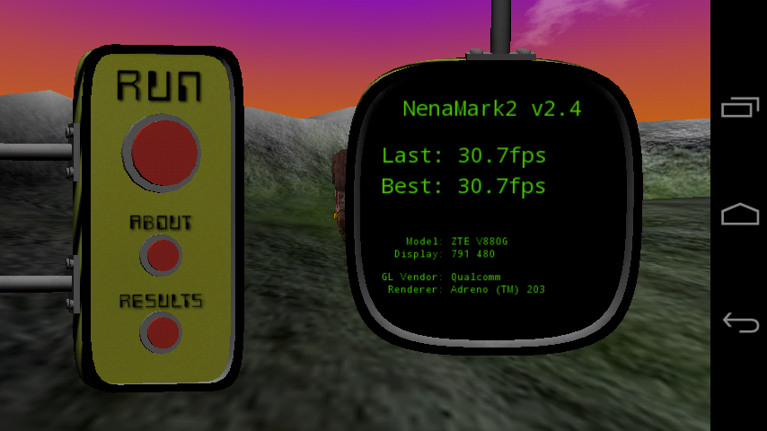 В тестах Quadrant Standard и AnTuTu смартфон ZTE V880G обошел конкурентов на основе чипов MT6575/6577. Однако разница между баллами мобильных устройств не очень велика и обусловлена преимуществом в разрешении героя обзора и, соответственно, более быстрым обсчетом трехмерных сцен. Этот вывод подтверждается следующим тестом — NenaMark.