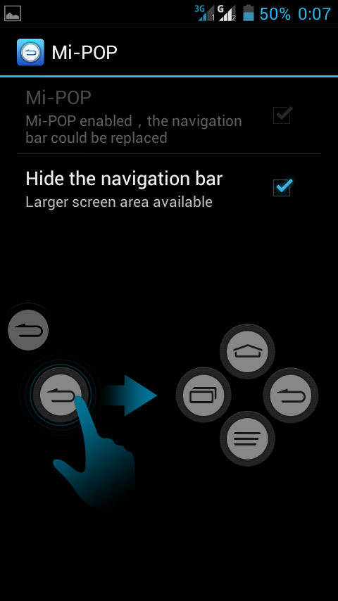 В-третьих, это замена системным виртуальным клавишам Mi-Pop, которая как раз-таки позволяет не только добавить кнопку вызова меню, но и отдать программам всю площадь экрана. К сожалению, у нее есть свои недостатки: так, она не всегда правильно понимает, когда нужно показать все клавиши управления, а когда пользователь просто перемещает единственную кнопку по экрану.