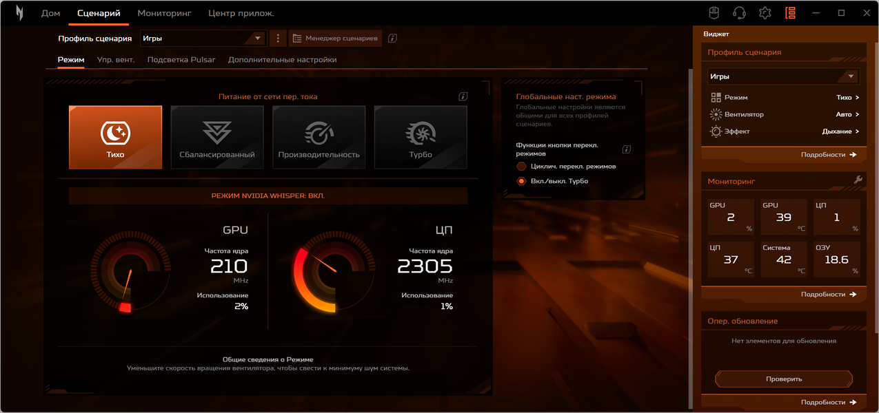 В разделе «Мониторинг» в окно приложения выводятся тактовая частота, температура, степень загрузки вычислителей, скорость вращения вентиляторов системы охлаждения, использование ОЗУ и загрузка кабельного и беспроводного сетевых подключений.