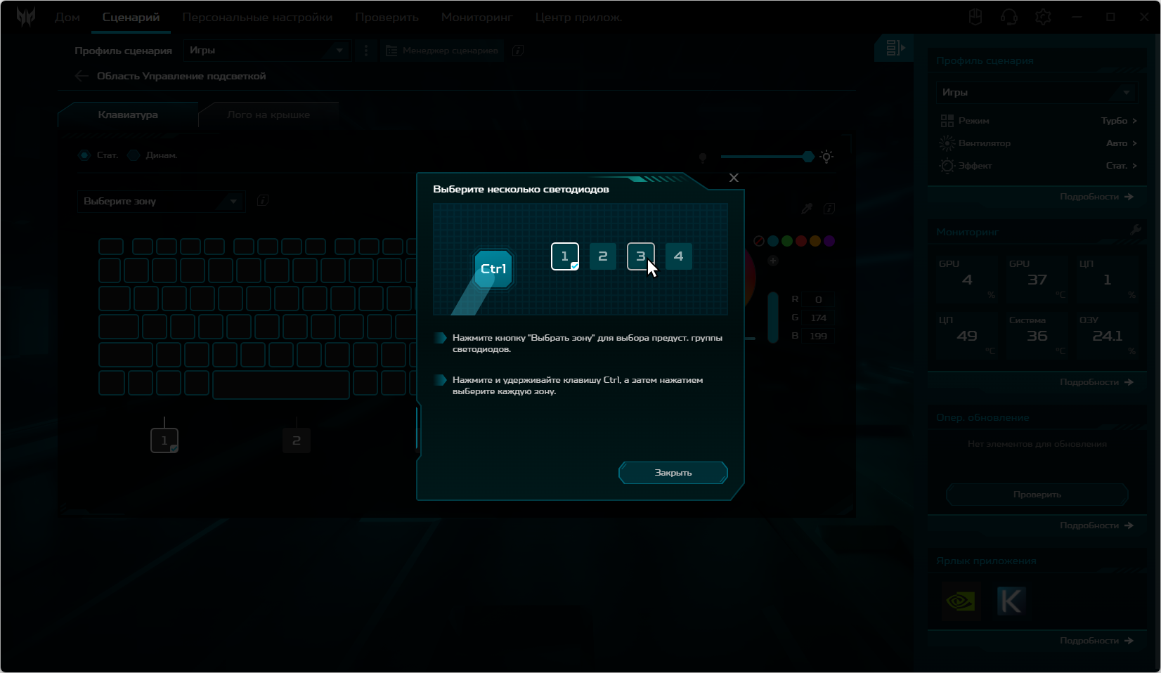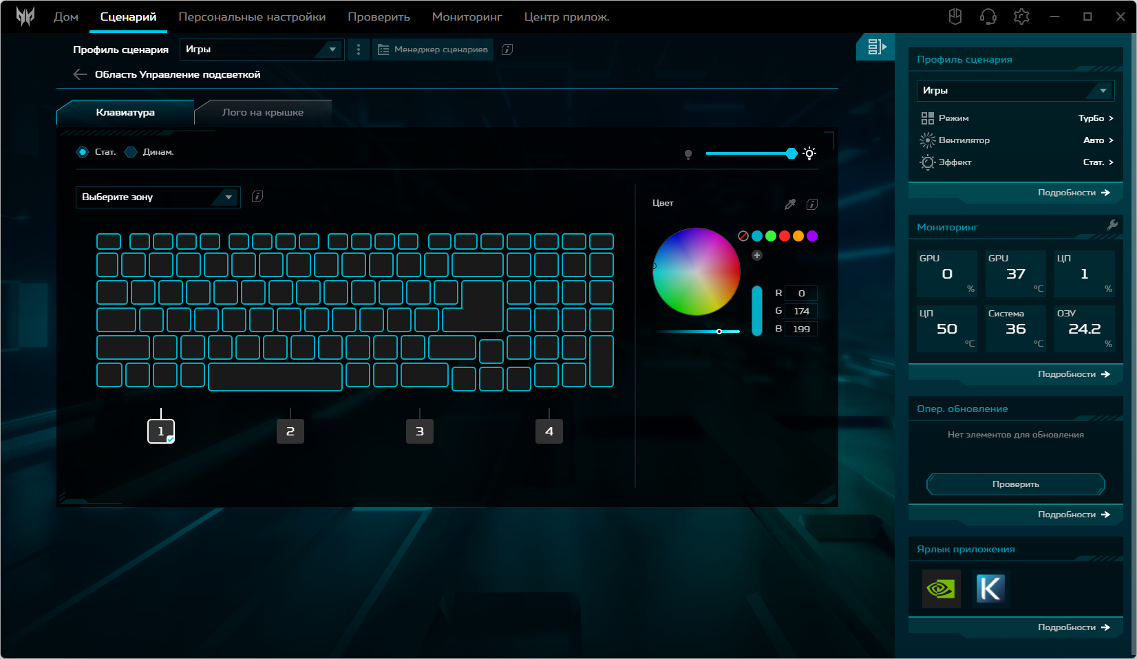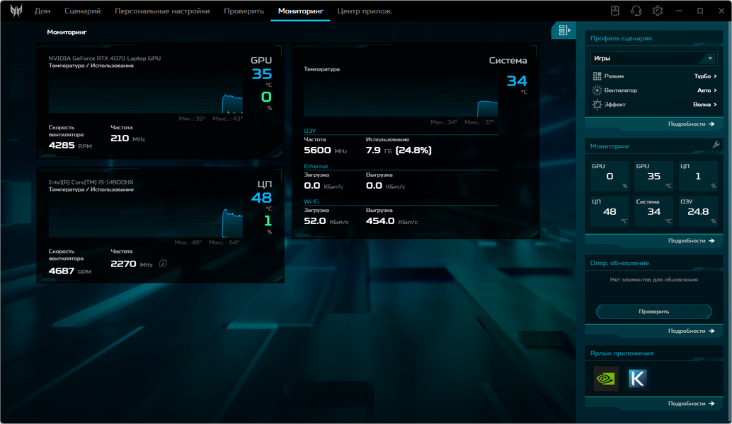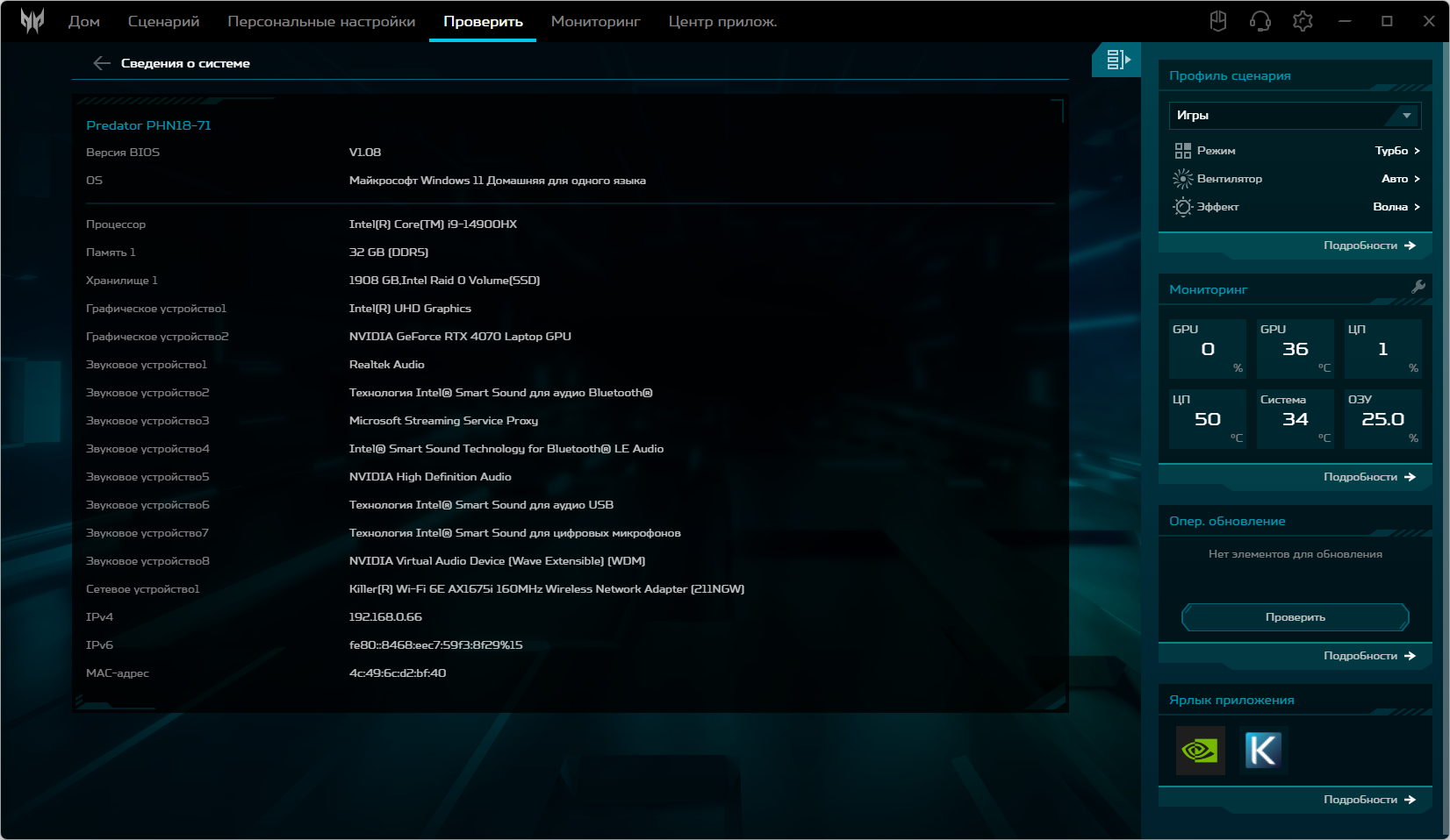 Ноутбук Acer Predator Helios Neo 18 PHN18-71 поставляется с Windows 11, триал-версией Microsoft Office 365, сетап-инициатором Яндекс и фирменной утилитой PredatorSense. Последняя представляет наибольшую ценность при испытаниях машины, поскольку дает возможность настраивать разные параметры и выбирать сценарии (профили, пресеты) работы.
